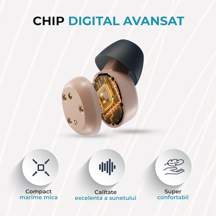 - Design intraauricular (In-Ear): Se introduce direct in ureche, fiind extrem de discret si greu de observat.