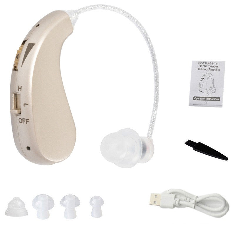 Aparat auditiv retroauricular BTE Reincarcabil, Flippy, Set 2 bucati Stinga Dreapta, Standard European, Aparat auditiv Cu incarcator, Aparat pentru Auz, 12 x 8.5 x 4 cm, 89 g, Auriu